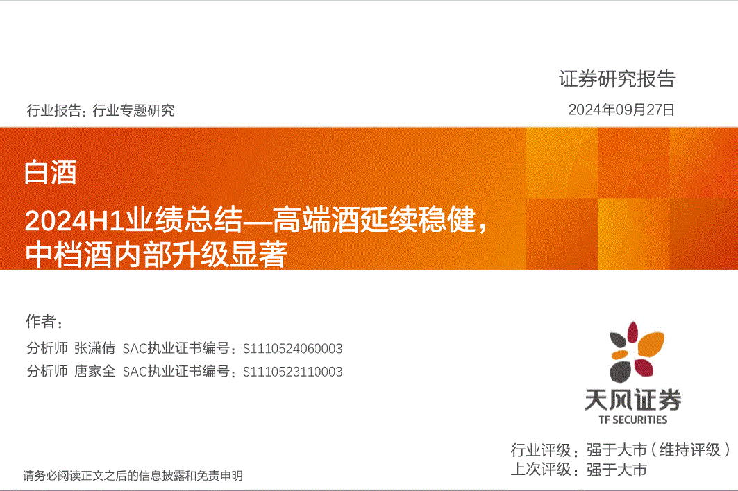 白酒行业:天风证券-白酒行业2024H1业绩总结:高端酒延续稳健,中档酒内部升级显著-240927