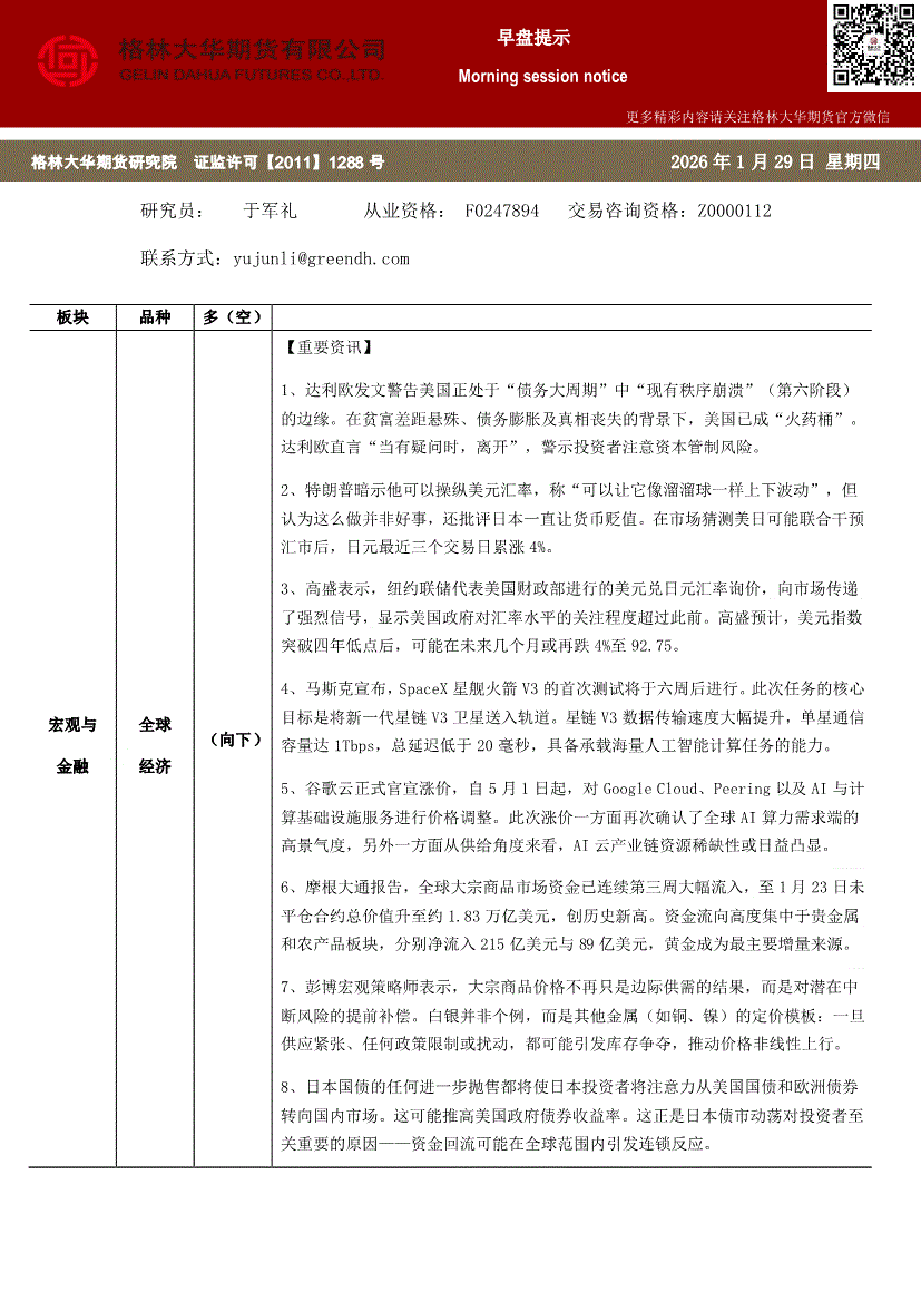 格林大华期货-早盘提示;全球经济-260121