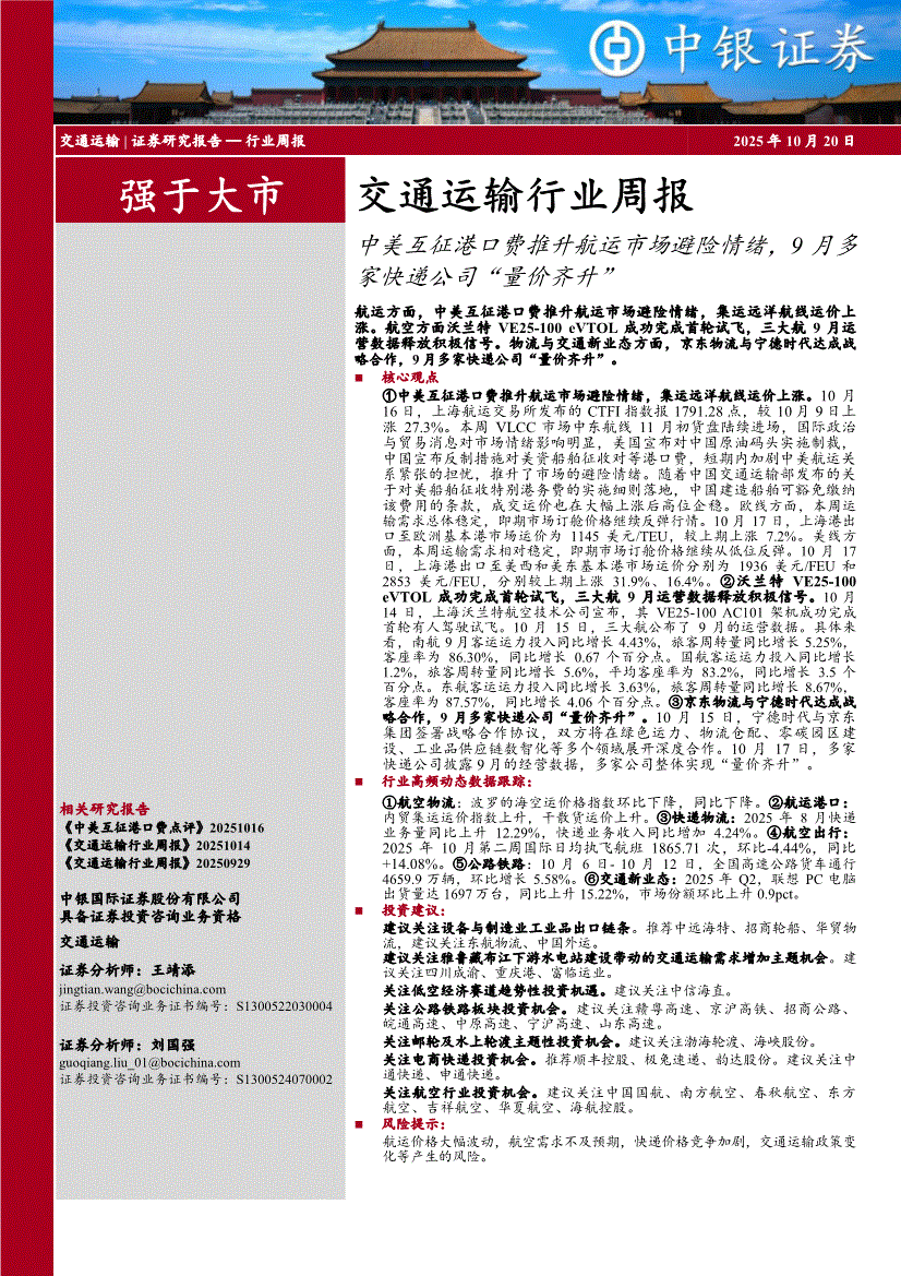 交通运输行业:中银国际-交通运输行业周报:中美互征港口费推升航运市场避险情绪,9月多家快递公司“量价齐升”-251020