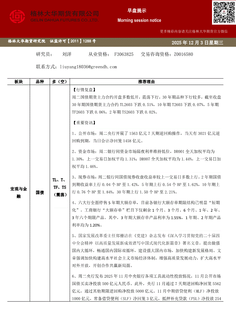 格林大华期货-宏观国债周报:30年期国债大幅回撤,多数品种震荡格局-251205
