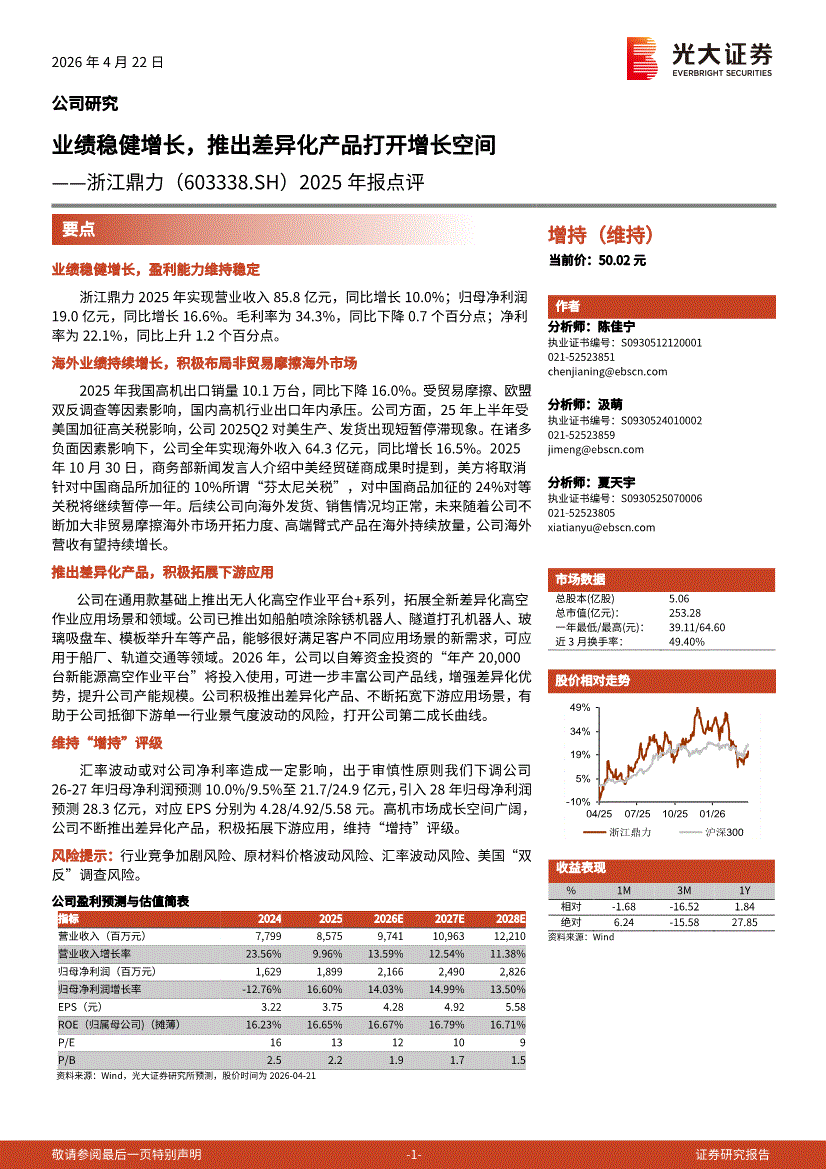 浙江鼎力:光大证券-浙江鼎力-603338-2025年报点评:业绩稳健增长,推出差异化产品打开增长空间-260422