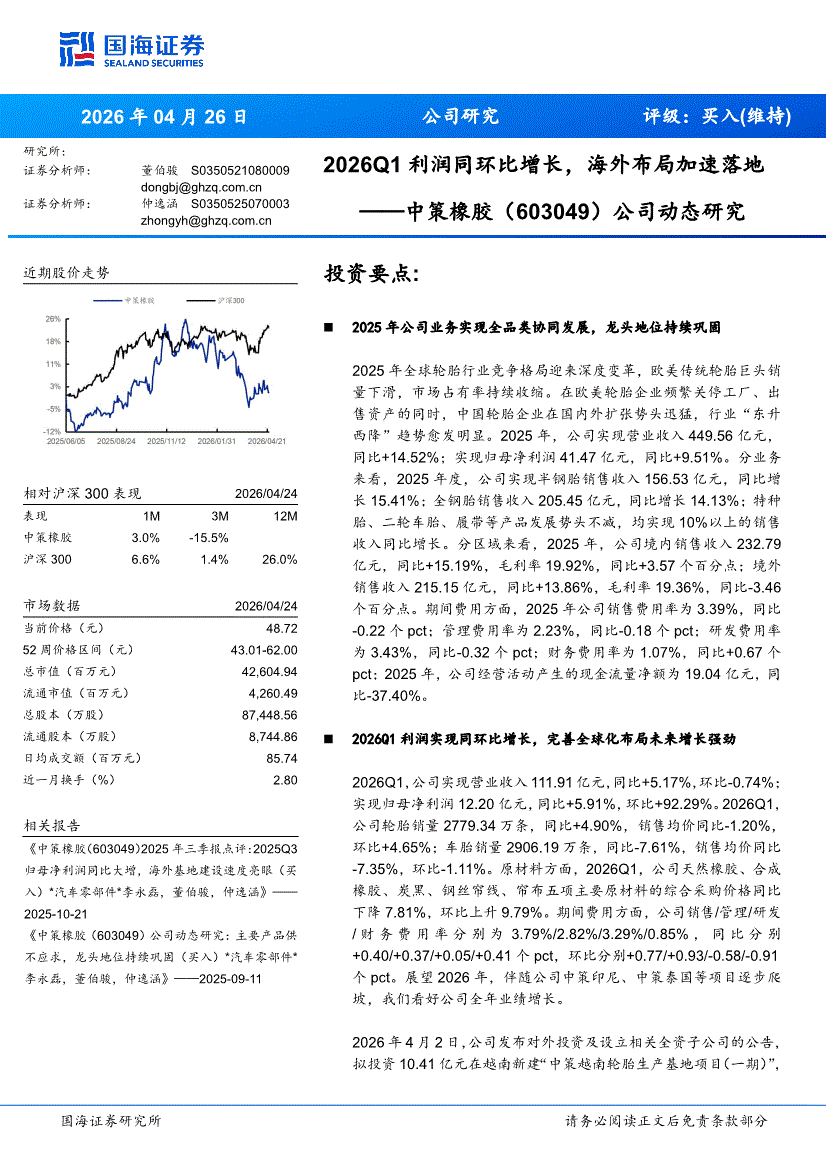 中策橡胶:国海证券-中策橡胶-603049-公司动态研究:2026Q1利润同环比增长,海外布局加速落地-260426