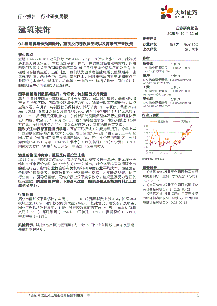 建筑装饰行业:天风证券-建筑装饰行业研究周报:Q4基建稳增长预期提升,重视反内卷投资主线以及高景气产业投资-251012