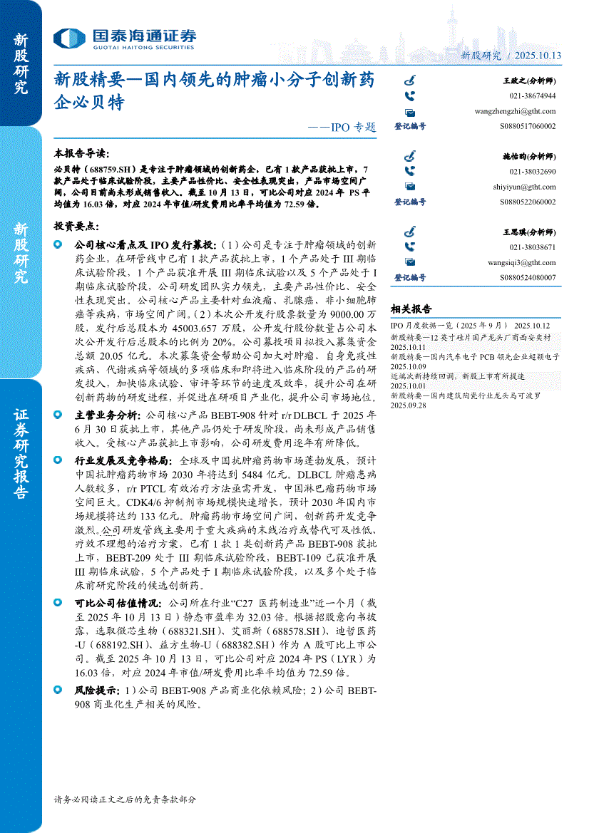 国泰海通证券-IPO专题:新股精要—国内领先的肿瘤小分子创新药企必贝特-251013