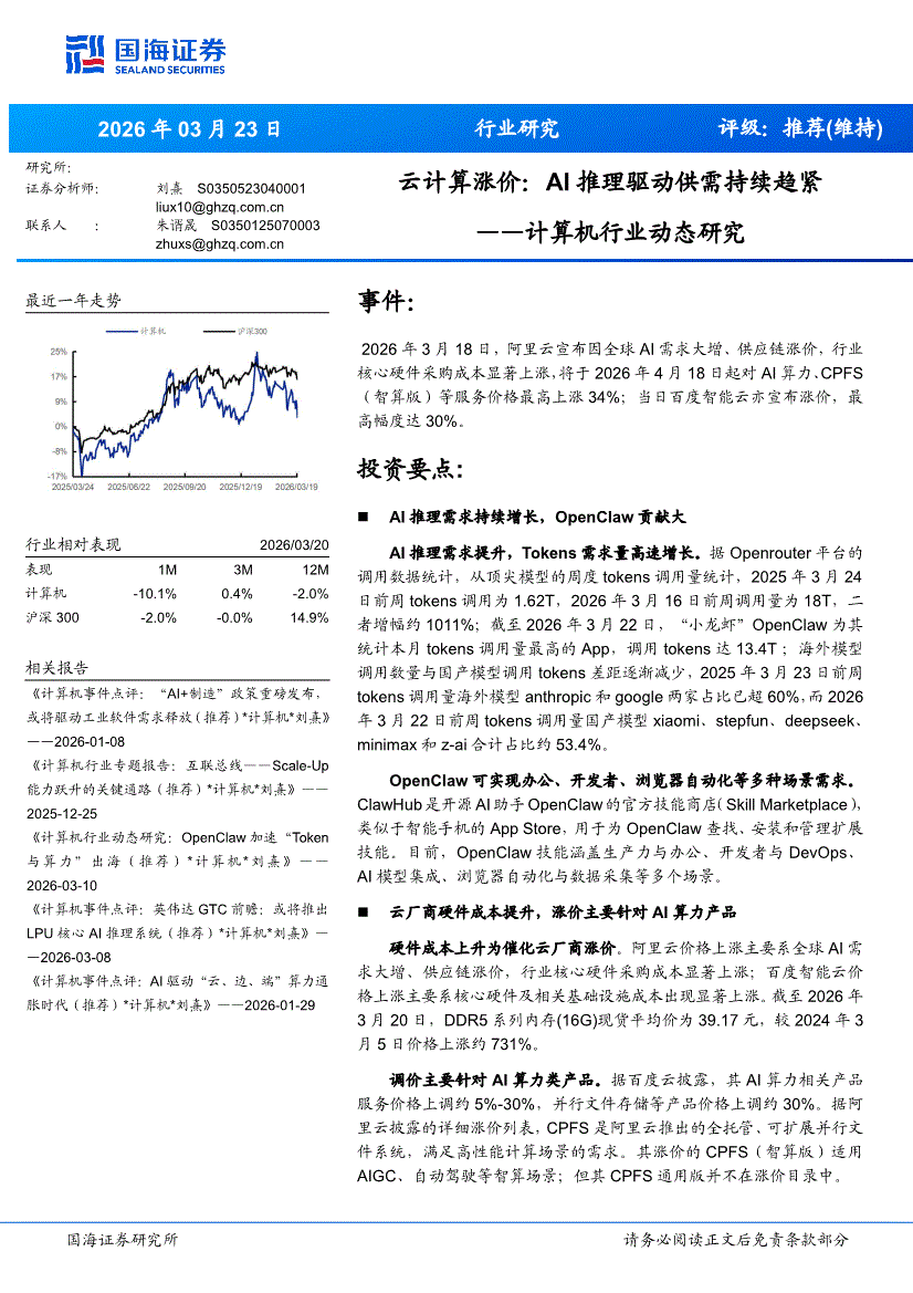 计算机行业:国海证券-计算机行业动态研究:云计算涨价,AI推理驱动供需持续趋紧-260323