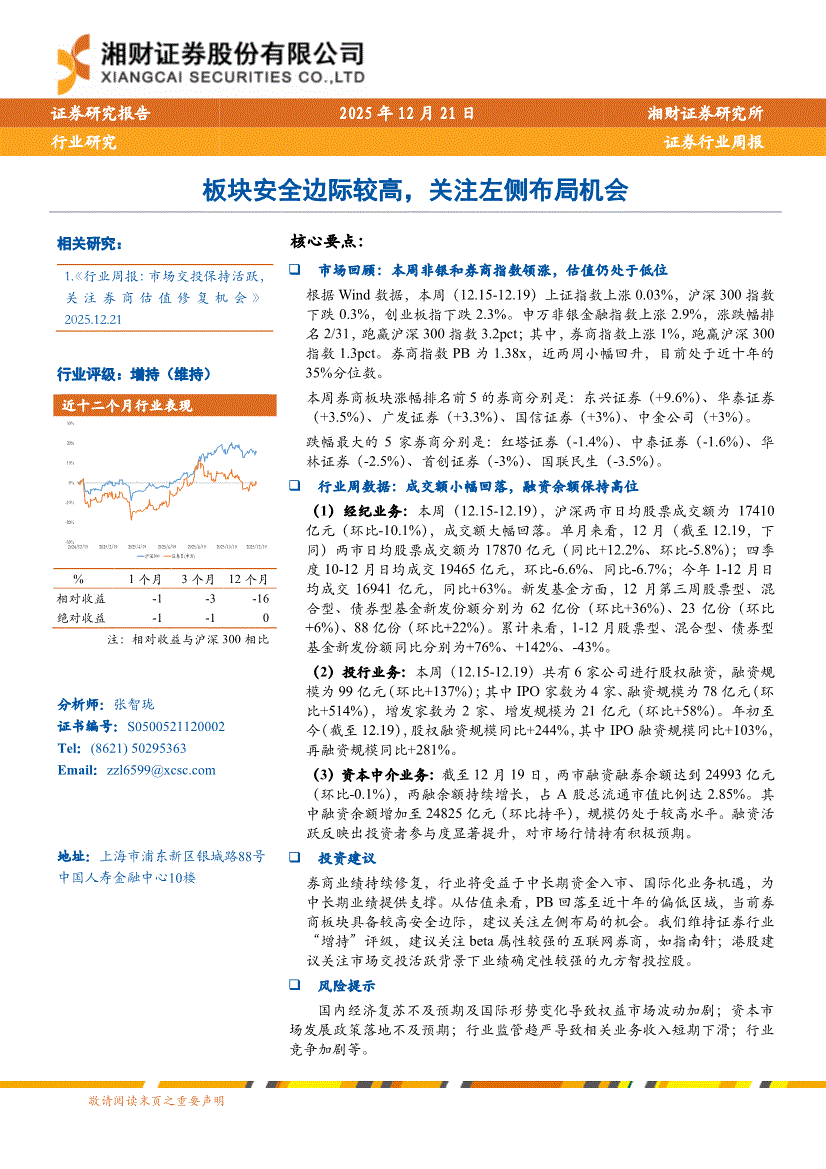 证券行业:湘财证券-证券行业周报:板块安全边际较高,关注左侧布局机会-251221