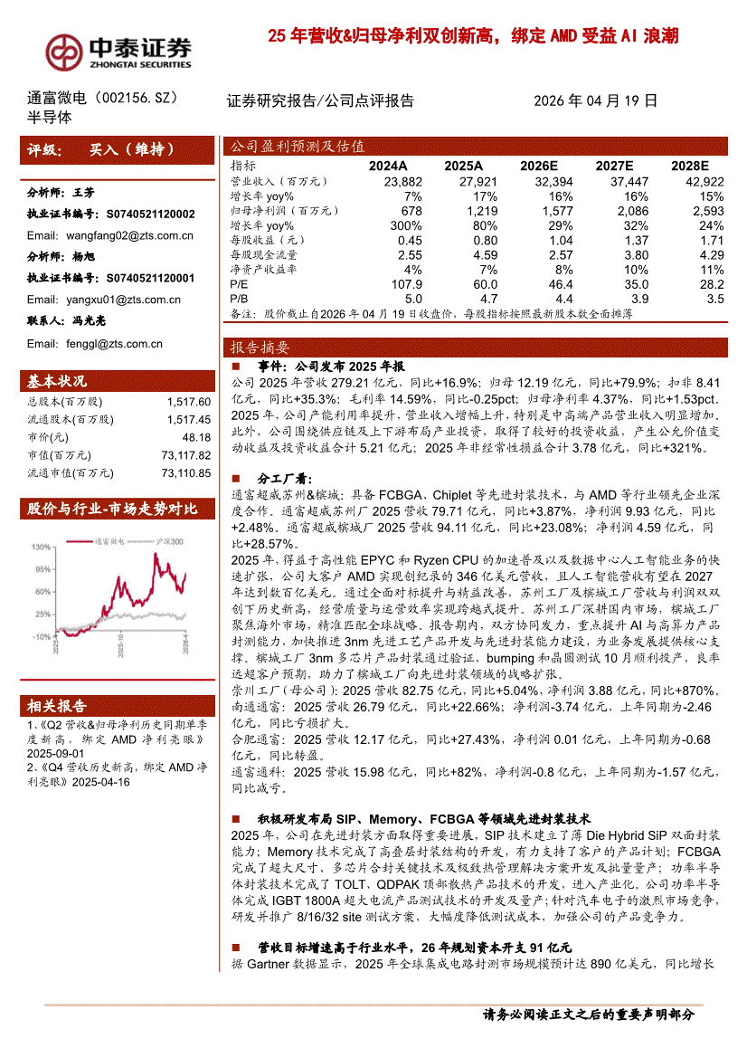 通富微电:中泰证券-通富微电-002156-25年营收&归母净利双创新高,绑定AMD受益AI浪潮-260419