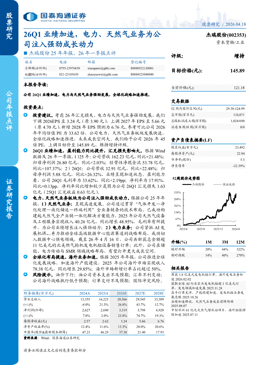 杰瑞股份:国泰海通证券-杰瑞股份-002353-25年年报、26年一季报点评:26Q1业绩加速,电力、天然气业务为公司注入强劲成长动力-260418