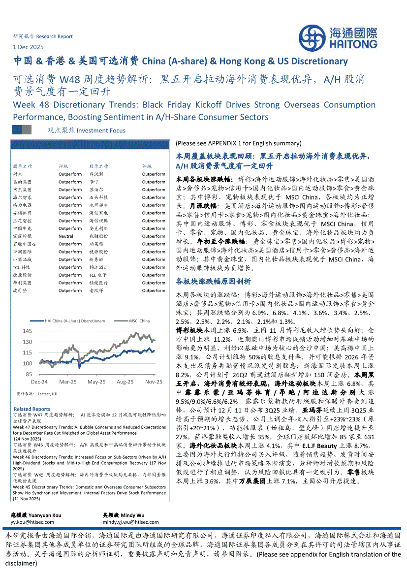 可选消费行业:海通国际-可选消费行业W48周度趋势解析:黑五开启拉动海外消费表现优异,A/H股消费景气度有一定回升-251201