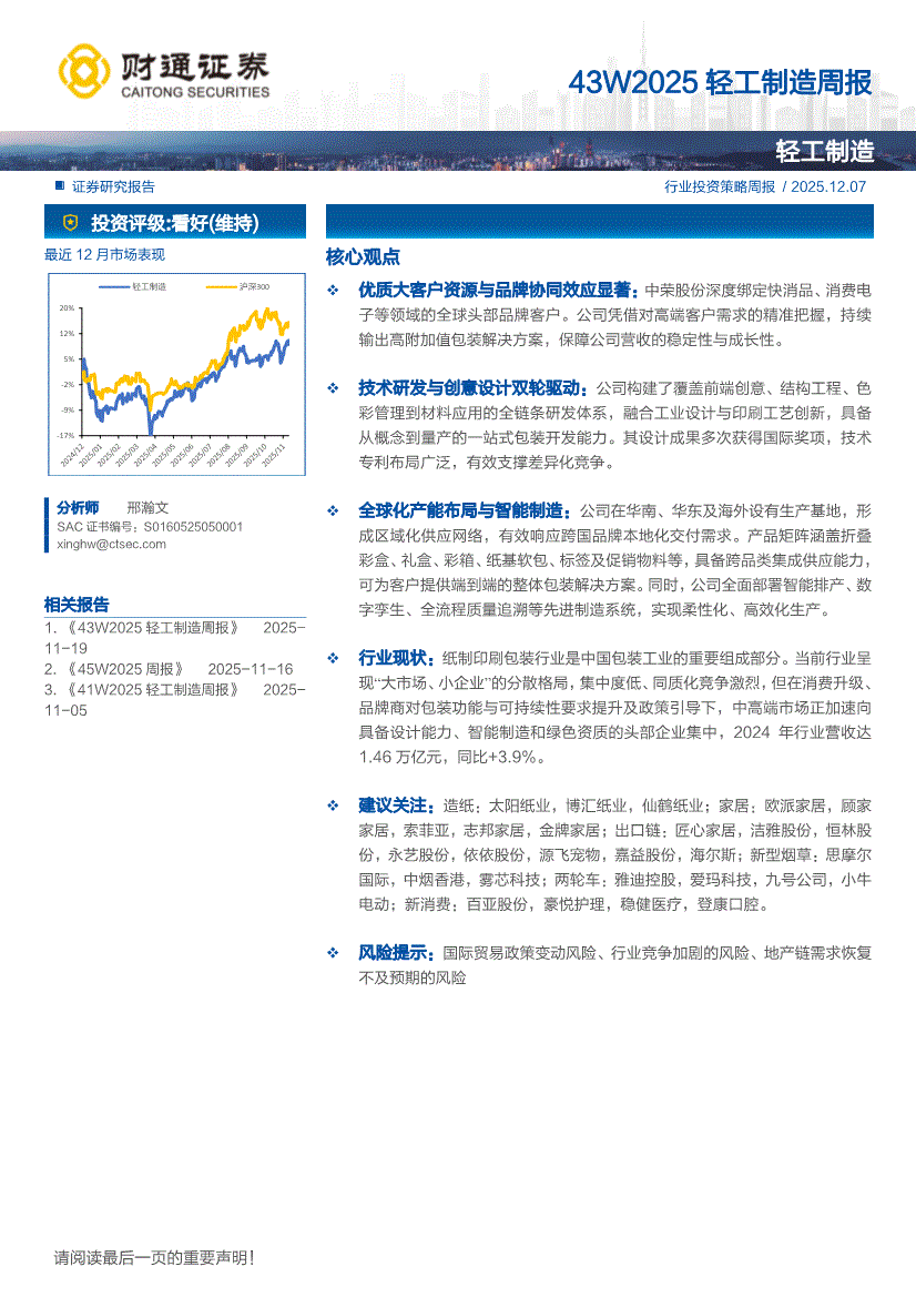 轻工制造行业:财通证券-轻工制造行业:43W2025轻工制造周报-251207