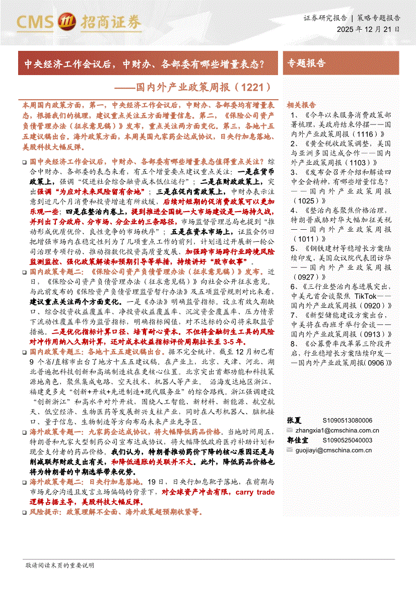 招商证券-国内外产业政策周报(1221):中央经济工作会议后,中财办、各部委有哪些增量表态?-251221