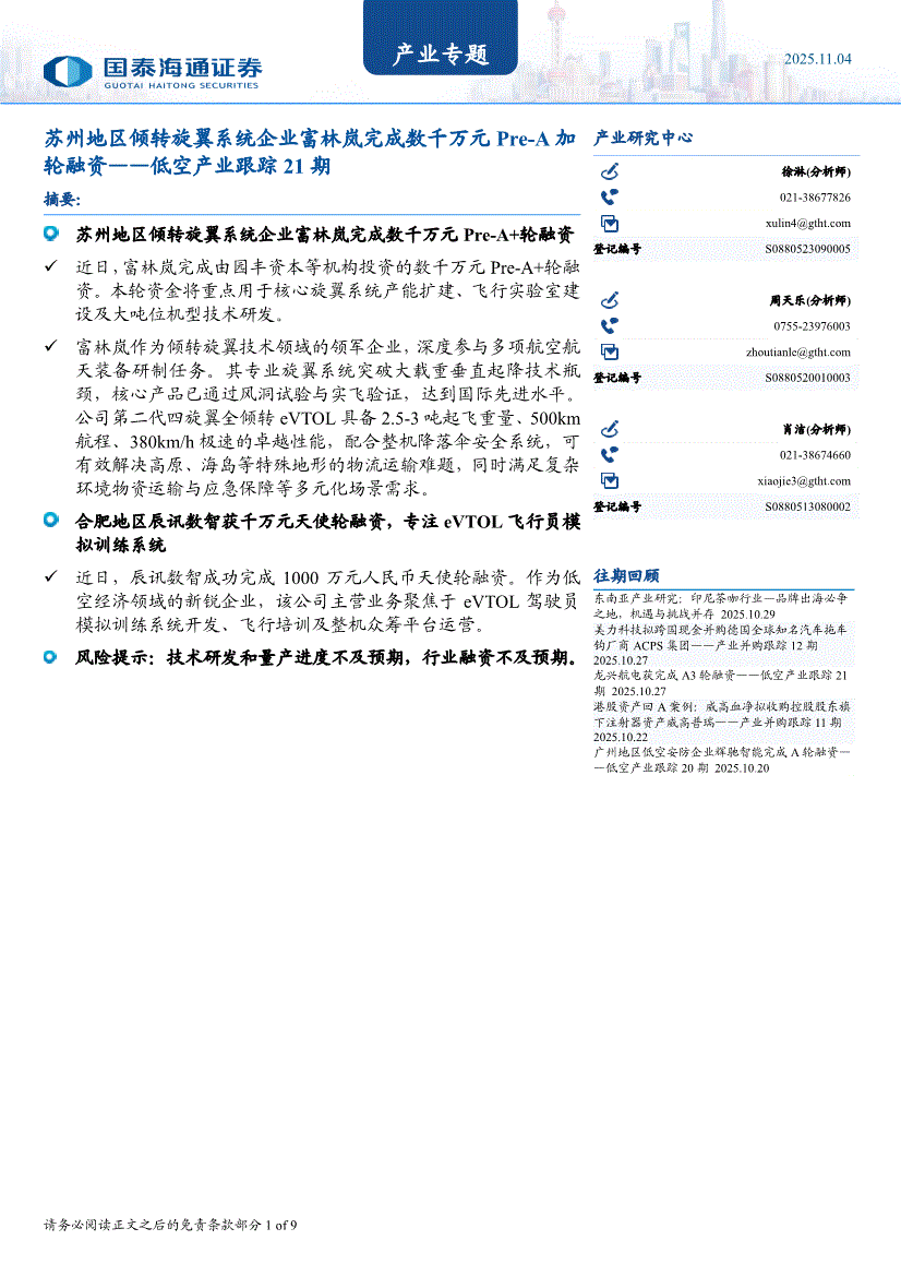 国泰海通证券-产业专题:低空产业跟踪21期,苏州地区倾转旋翼系统企业富林岚完成数千万元Pre~A加轮融资-251104