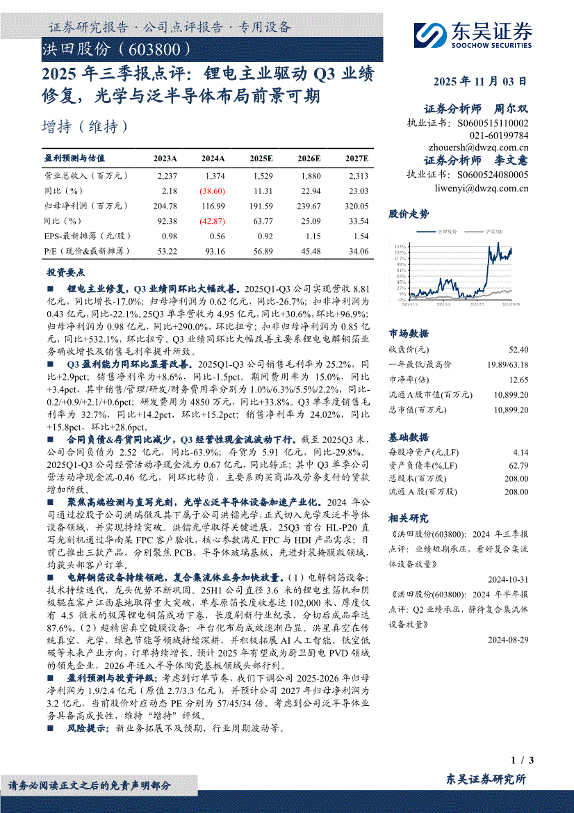 洪田股份:东吴证券-洪田股份-603800-2025年三季报点评:锂电主业驱动Q3业绩修复,光学与泛半导体布局前景可期-251103