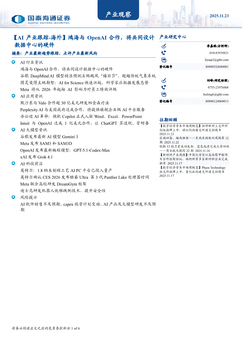 国泰海通证券-产业观察:【AI产业跟踪~海外】鸿海与OpenAI合作,将共同设计数据中心的硬件-251123