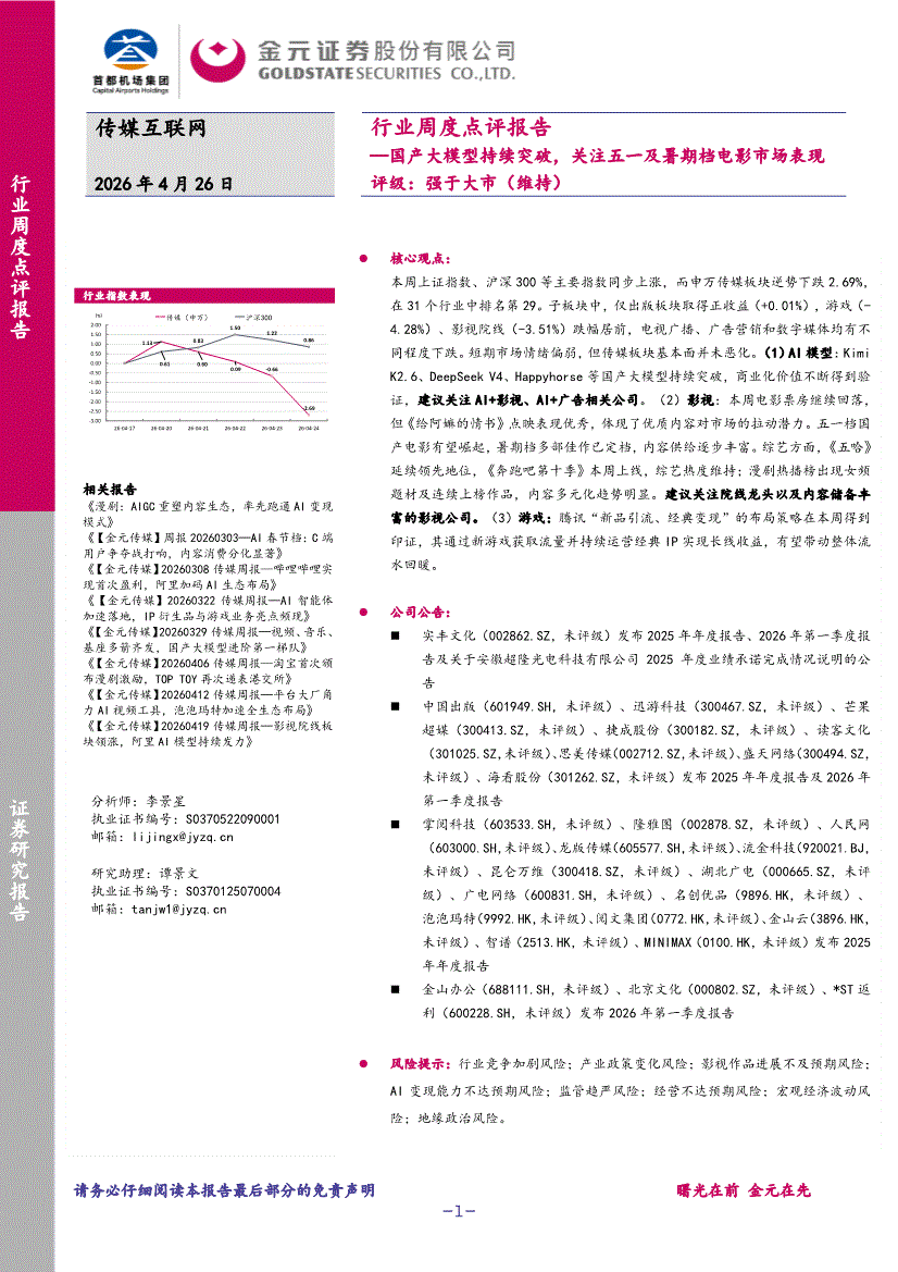 传媒互联网行业:金元证券-传媒互联网行业周度点评报告:国产大模型持续突破,关注五一及暑期档电影市场表现-260426