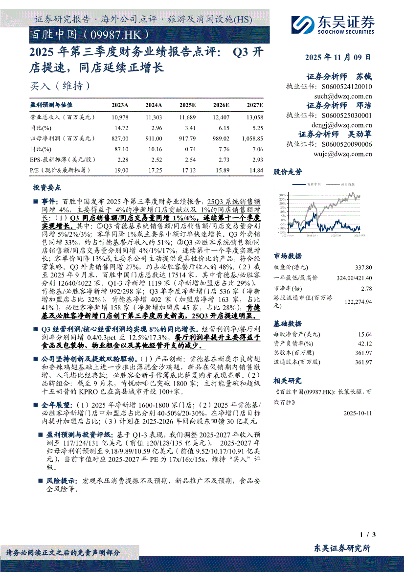 百胜中国:东吴证券-百胜中国-9987.HK-2025年第三季度财务业绩报告点评:Q3开店提速,同店延续正增长-251109
