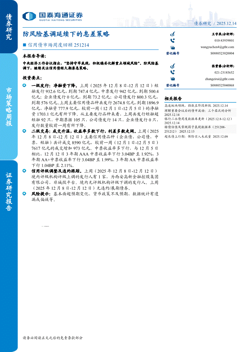 国泰海通证券-信用债市场周度回顾:防风险基调延续下的息差策略-251214
