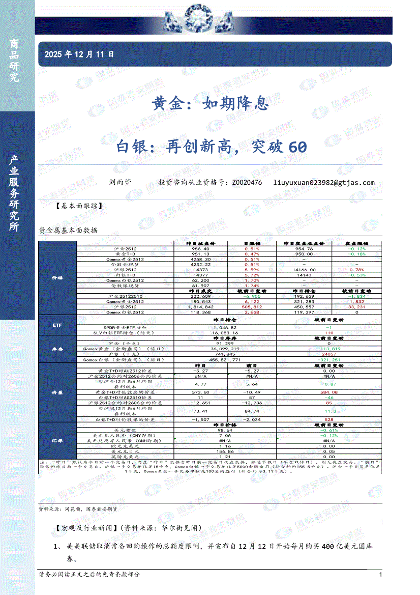 国泰君安期货-黄金:如期降息,白银,再创新高,突破60-251211