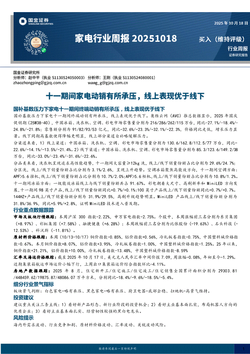 家电行业:国金证券-家电行业周报:十一期间家电动销有所承压,线上表现优于线下-251018