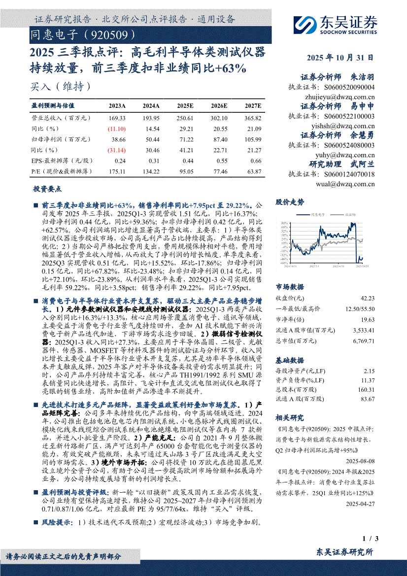 同惠电子:东吴证券-同惠电子-920509-2025三季报点评:高毛利半导体类测试仪器持续放量,前三季度扣非业绩同比+63%-251031