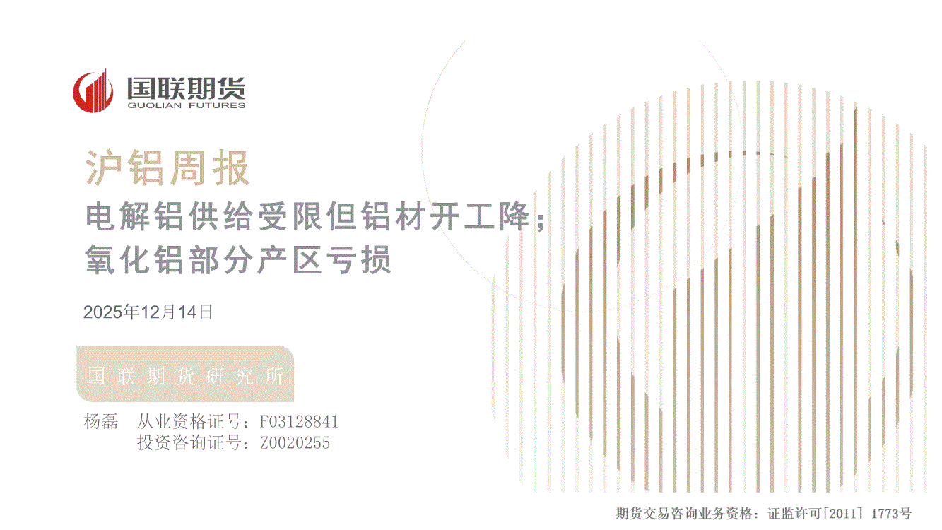 国联期货-沪铝周报:电解铝供给受限但铝材开工降;氧化铝部分产区亏损-251214