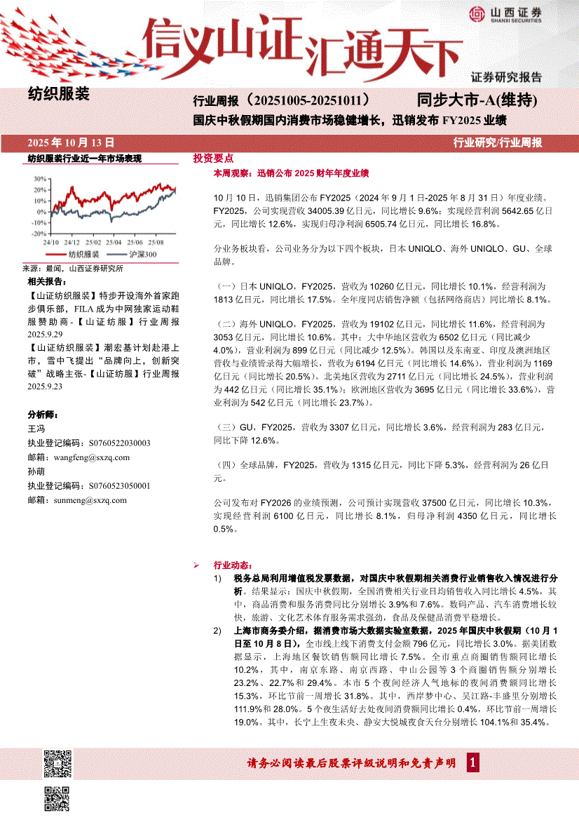 山西证券-纺织服装行业周报:国庆中秋假期国内消费市场稳健增长,迅销发布FY2025业绩-251013