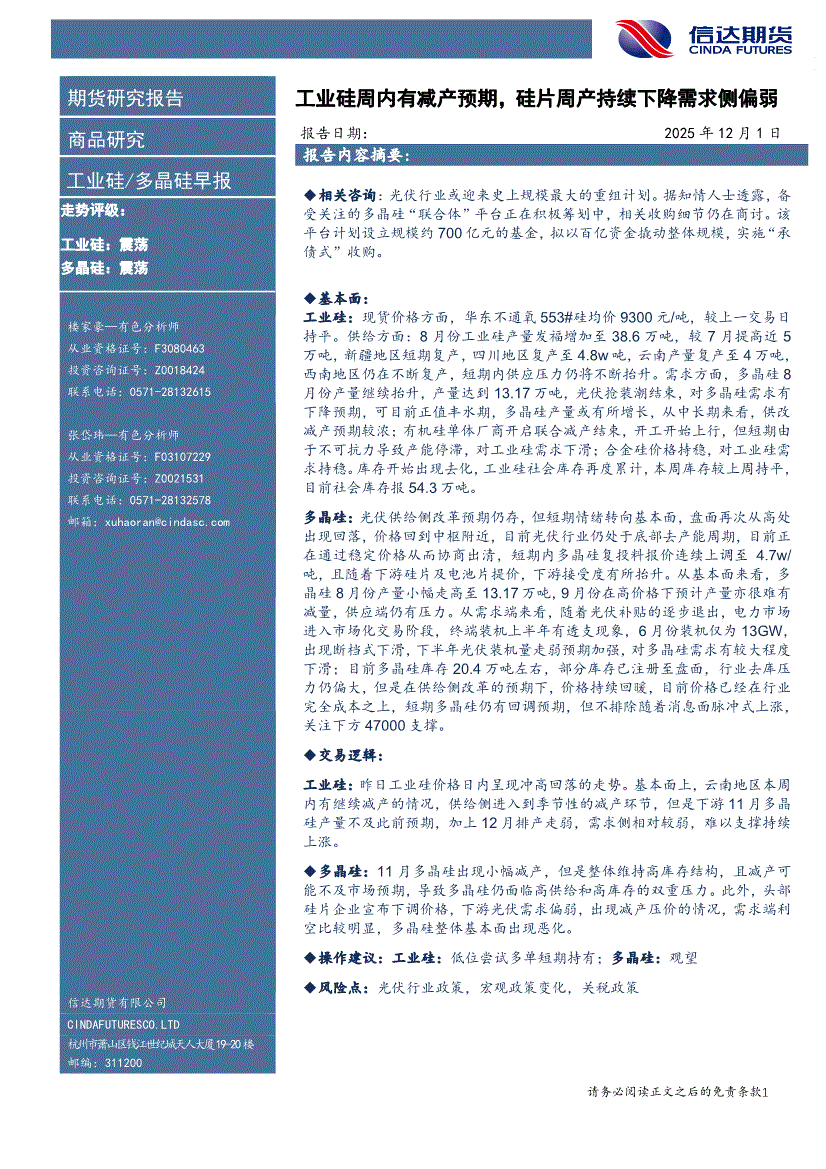 信达期货-工业硅/多晶硅早报:工业硅周内有减产预期,硅片周产持续下降需求侧偏弱-251201