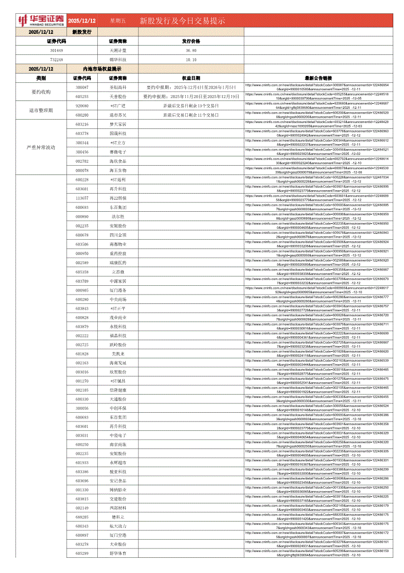 华宝证券-新股发行及今日交易提示-251212