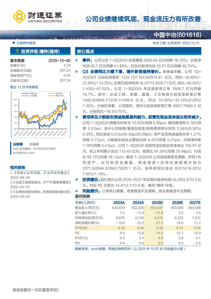 中国中冶:财通证券-中国中冶-601618-公司业绩继续筑底,现金流压力有所改善-251031