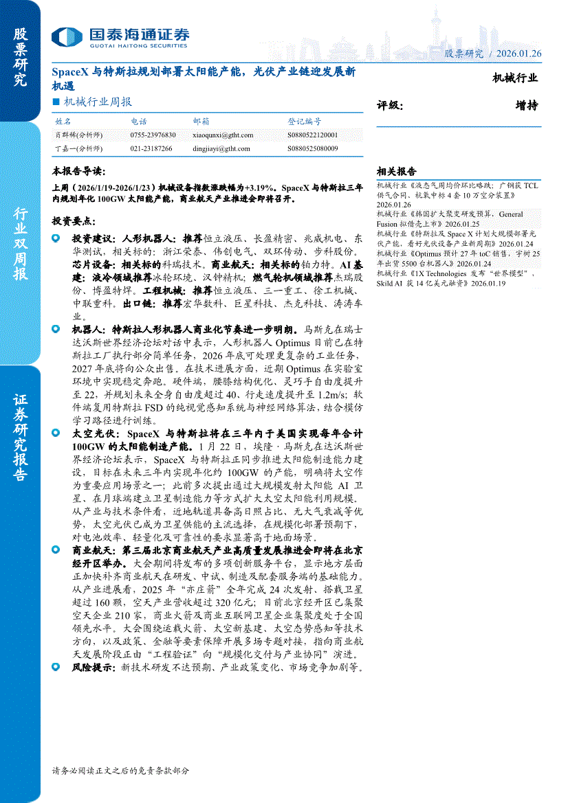 机械行业:国泰海通证券-机械行业周报:SpaceX与特斯拉规划部署太阳能产能,光伏产业链迎发展新机遇-260126