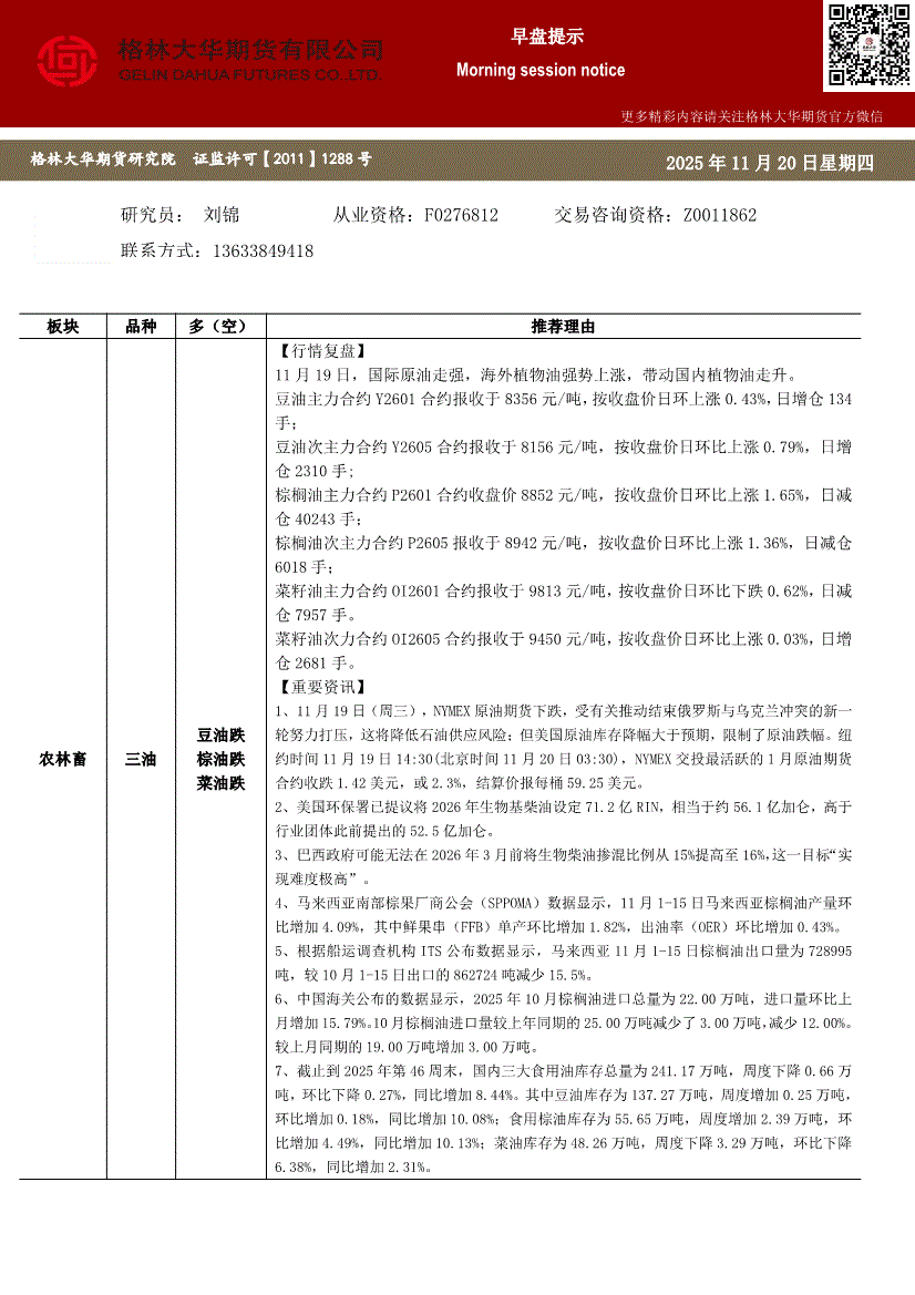 格林大华期货-一周简评:油脂延续分化,棕榈油最弱,豆油震荡,菜籽油最强,蛋白调整空间有限-251122