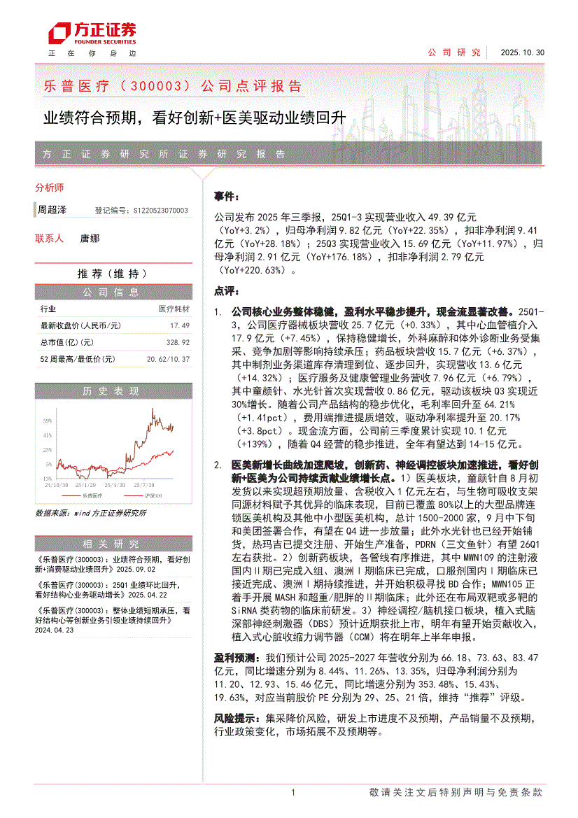 乐普医疗:方正证券-乐普医疗-300003-公司点评报告:业绩符合预期,看好创新+医美驱动业绩回升-251030