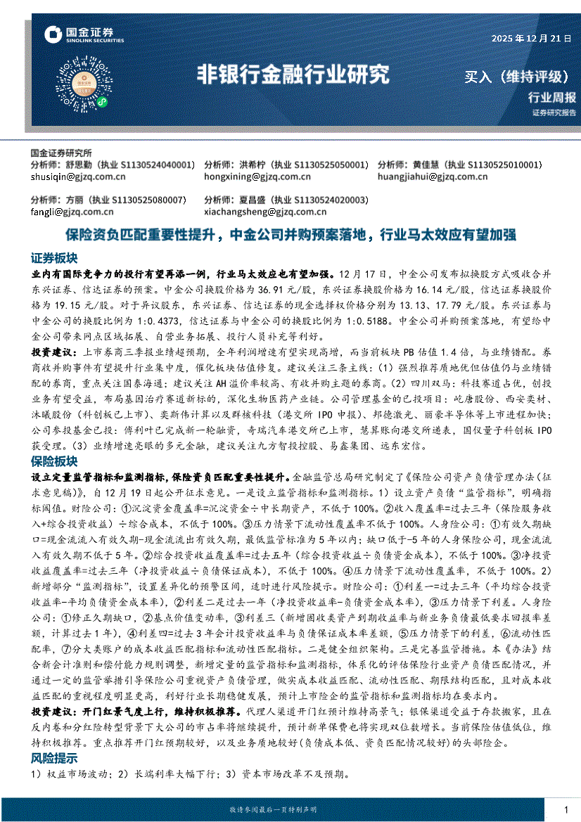 非银行金融行业:国金证券-非银行金融行业周报:保险资负匹配重要性提升,中金并购预案落地,行业马太效应加强-251221