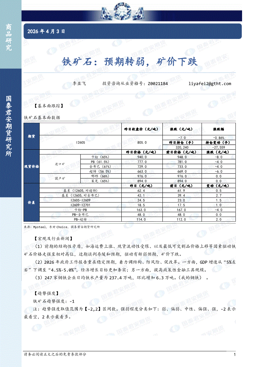 国泰君安期货-铁矿石:预期转弱,矿价下跌-260403