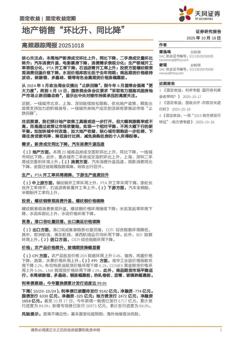 天风证券-高频跟踪周报:地产销售“环比升、同比降”-251018