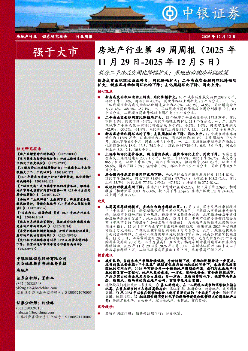 中银国际-房地产行业第49周周报(2025年11月29日~2025年12月5日):新房二手房成交同比降幅扩大;多地出台购房补贴政策-251212