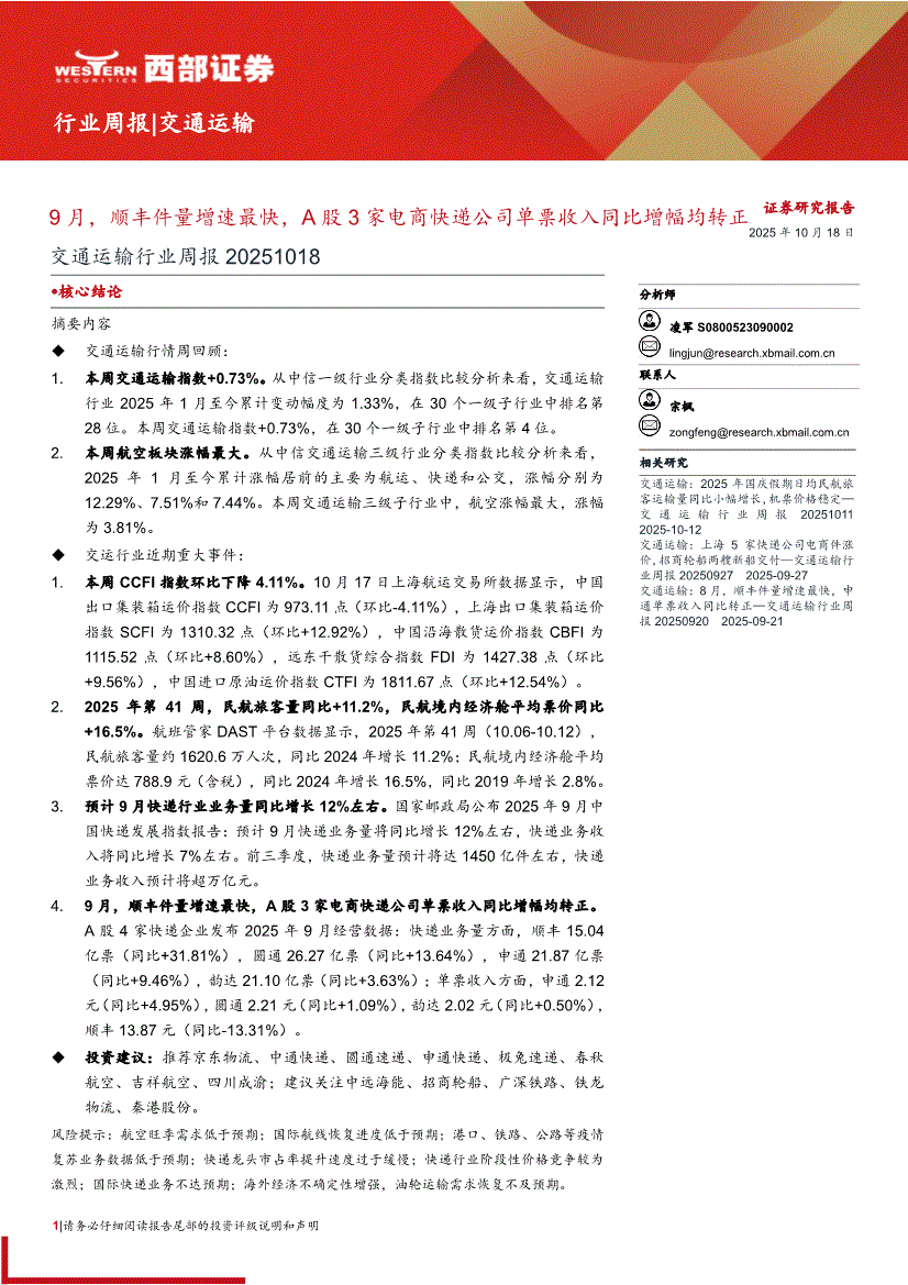 西部证券-交通运输行业周报:9月,顺丰件量增速最快,A股3家电商快递公司单票收入同比增幅均转正-251018