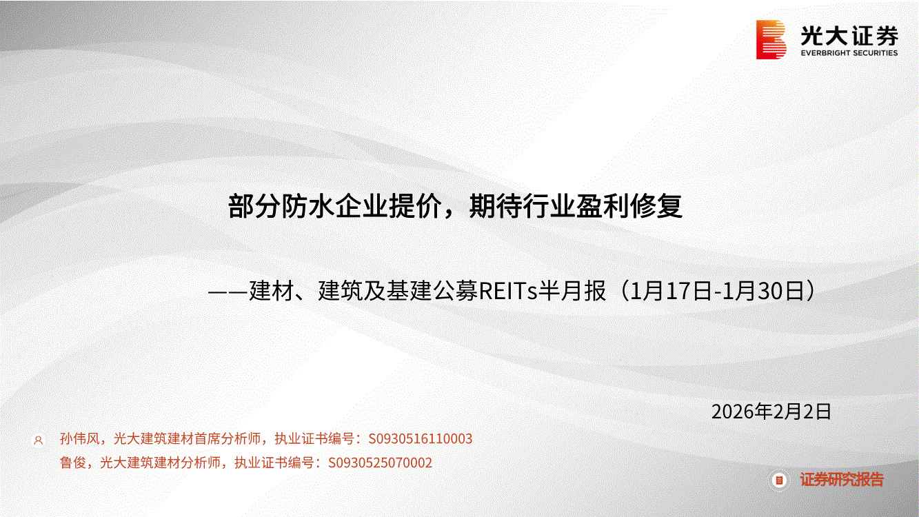 建材、建筑及基建公募REITs行业:光大证券-建材、建筑及基建公募REITs行业半月报(1月17日~1月30日):部分防水企业提价,期待行业盈利修复-260202