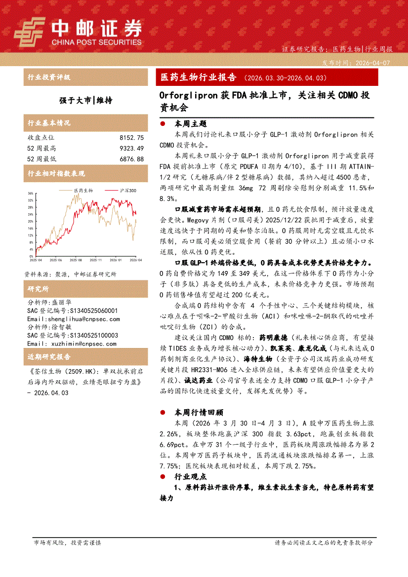 医药生物行业:中邮证券-医药生物行业周报:Orforglipron获FDA批准上市,关注相关CDMO投资机会-260407
