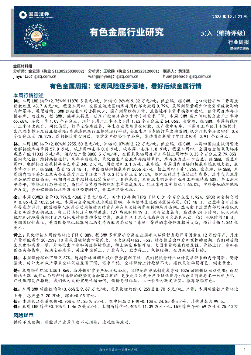 有色金属行业:国金证券-有色金属行业周报:宏观风险逐步落地,看好后续金属行情-251221