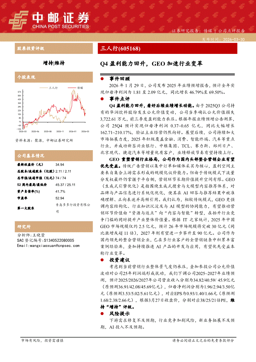 三人行:中邮证券-三人行-605168-Q4盈利能力回升,GEO加速行业变革-260330