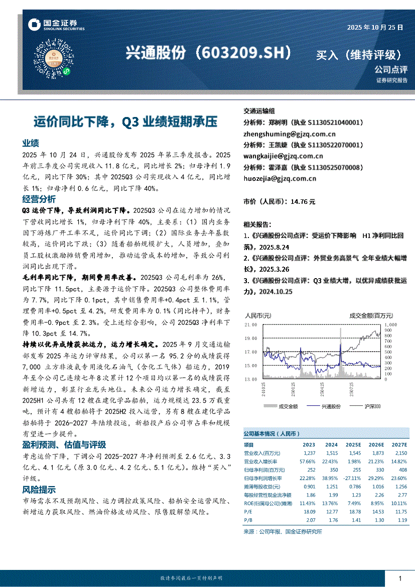 国金证券-兴通股份-603209-运价同比下降,Q3业绩短期承压-251025