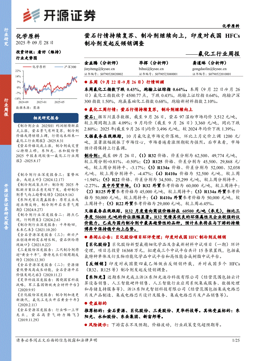 氟化工行业:开源证券-氟化工行业周报:萤石行情持续复苏、制冷剂继续向上,印度对我国HFCs制冷剂发起反倾销调查-250928