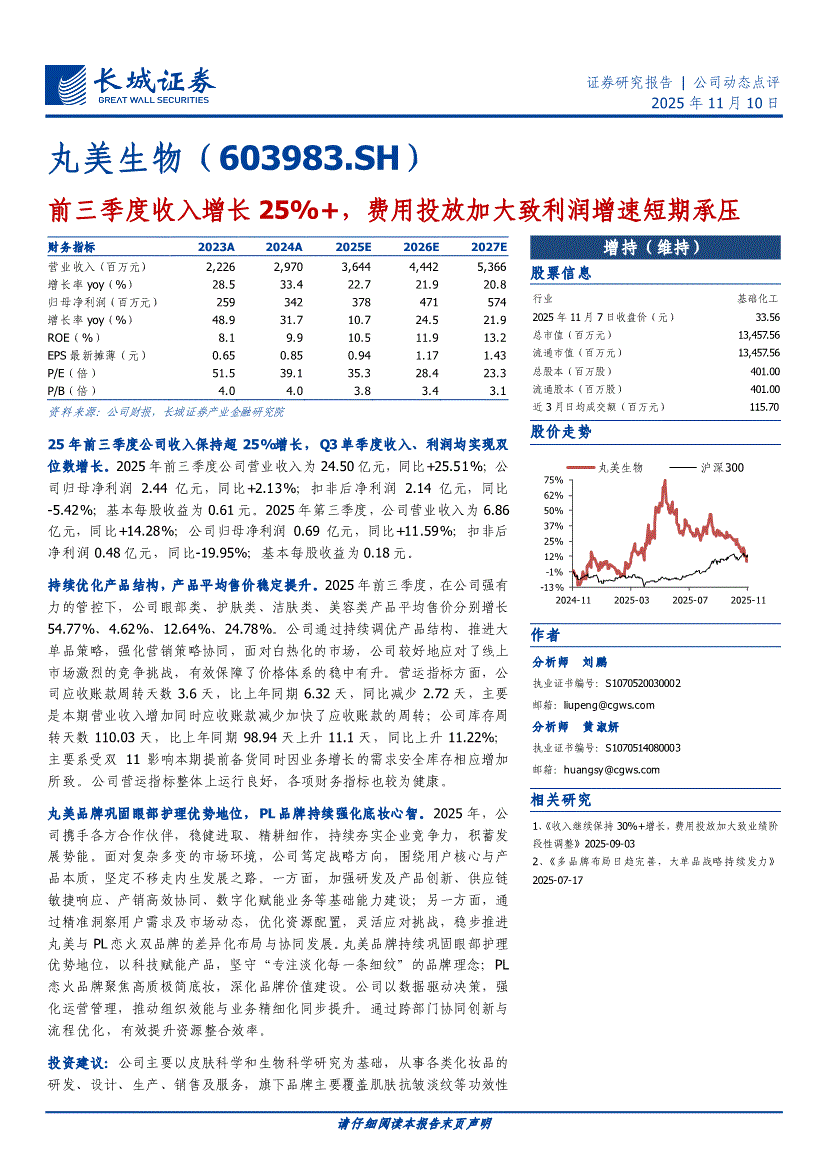 丸美生物:长城证券-丸美生物-603983-前三季度收入增长25%+,费用投放加大致利润增速短期承压-251110