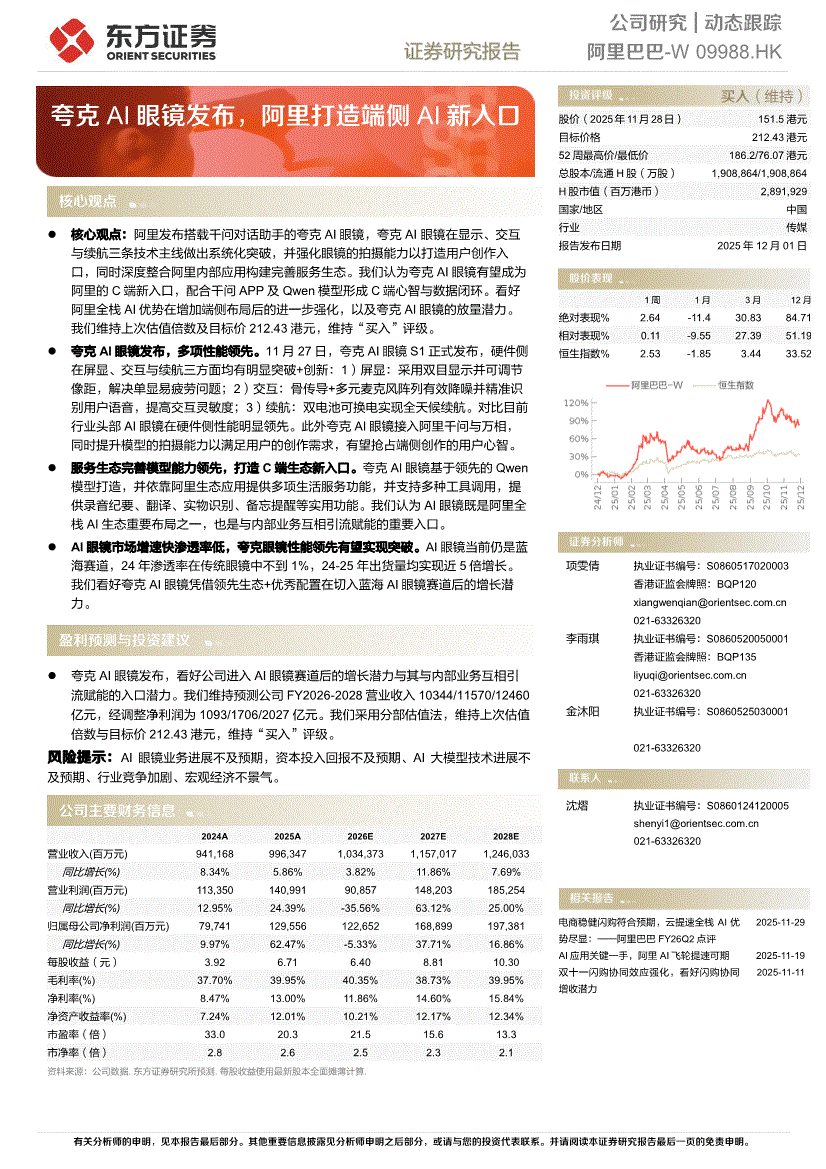 阿里巴巴~W:东方证券-阿里巴巴~W-9988.HK-夸克AI眼镜发布,阿里打造端侧AI新入口-251201