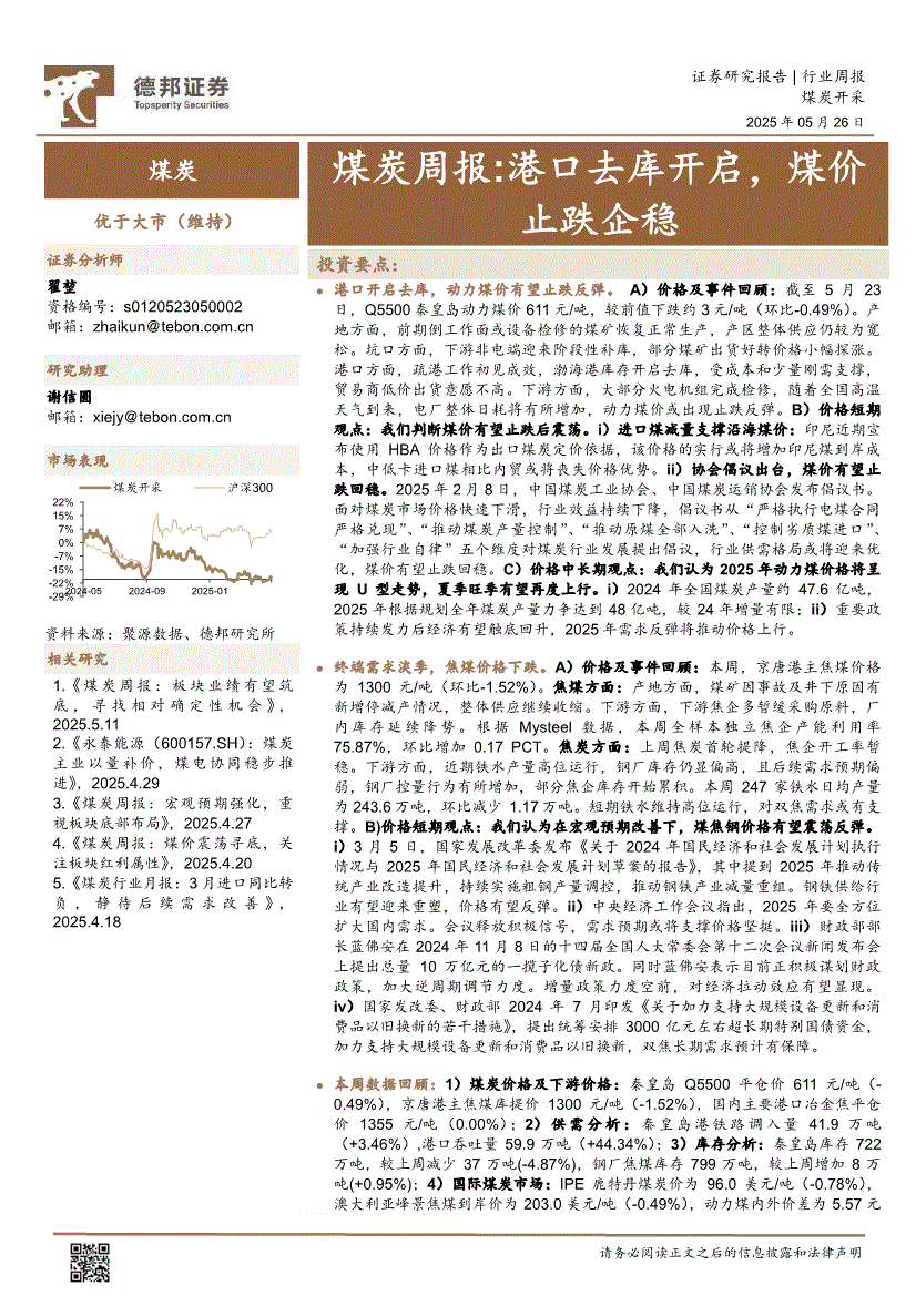 煤炭开采行业:德邦证券-煤炭行业周报:港口去库开启,煤价止跌企稳-250526